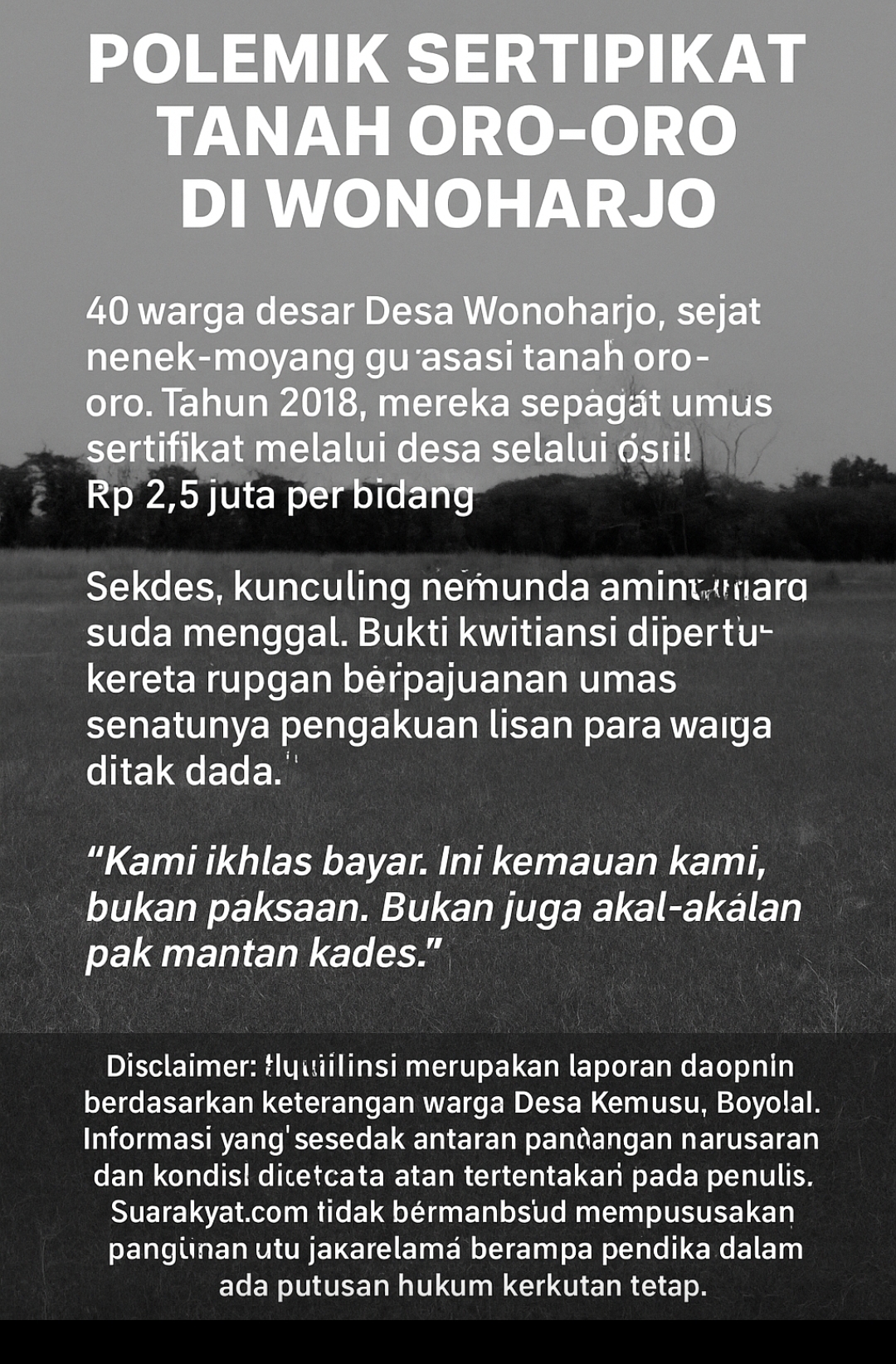 Tulisan ini merupakan laporan dan opini berdasarkan keterangan warga Desa Wonoharjo, Kecamatan Kemusu, Boyolali. Informasi yang disampaikan mencerminkan pandangan narasumber dan kondisi yang diceritakan kepada penulis. Proses hukum yang sedang berlangsung sepenuhnya menjadi kewenangan aparat berwenang. Suarakyat.com tidak bermaksud memutuskan benar atau salahnya pihak-pihak terkait sebelum ada putusan hukum yang berkekuatan tetap (inkracht).